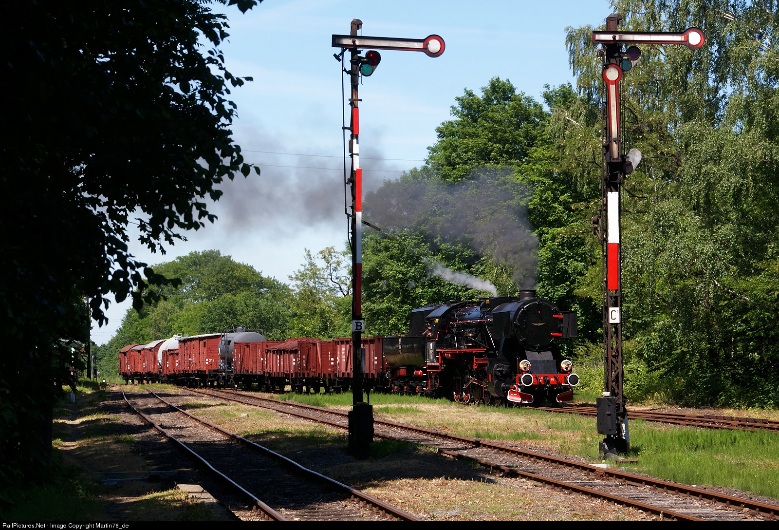 | The special freight train with Ty42-24 steam locomotive, from Wrocław Główny to Głuchołazy, enters the end station. Shaped semaphores are visible in the foreground. |