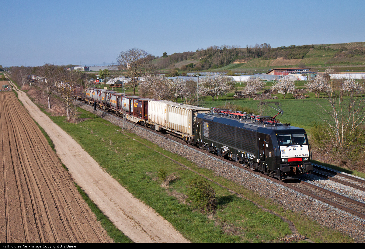 | SBB Cargo International multisystem locomotive 189 989, leased from MRCE Dispolok, is leading a southbound intermodal train. |