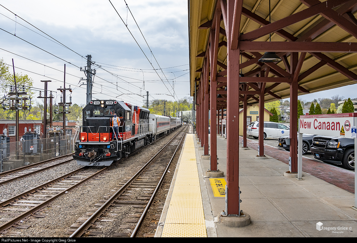The Metro North/ Department of Transportation Geometry Train pulls down track to clear up for the shuttle train at New Canaan Station in Connecticut. The train is tasked with traversing all of Metro North's mainline track while the middle coach, DOTX 221, collects geometry data reports for the FRA and US Department of Transportation.
