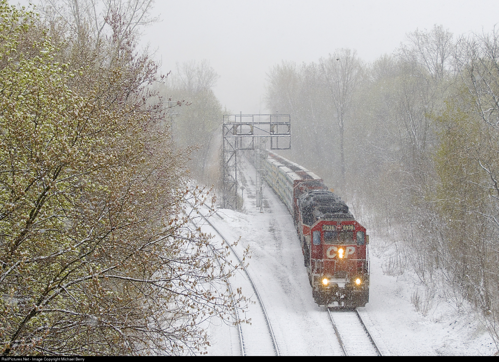 CP 251 is passing the North Jct lead, which commuter trains to and from Saint-Jérôme use to get from the Adirondack Sub to the Westmount Sub. A late April snowfall is apparent as the train heads past two sets of signals, one out of use.
