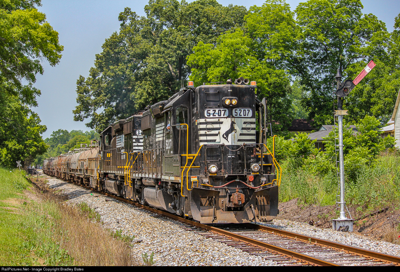 NS Train A84 heads north through downtown Talladega during the high sun hour on May 24th, 2012 on their way to work Precision Strip Steel Mill just north of town with NS GP38-2 High Hood #5207 leading an SD40-2 High Hood. |