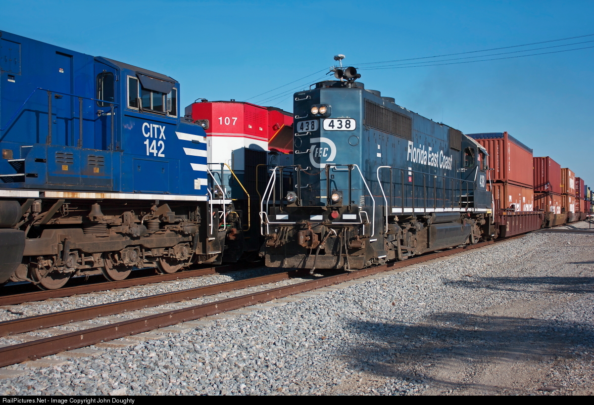 FEC 107 is slowly beginning to move FEC train 210 towards the north end of Micco Siding as southbound train FEC 123, with GP-40 FEC 438 running long hood forward, races past on the main line. FEC 438 is the only power for the 6,549 foot long southbound train, which usually runs through Micco before dawn, but was delayed due to engine problems with the lead SD40-2 locomotive. The lead locomotive was removed, leaving 438 to pull the train south to Miami.