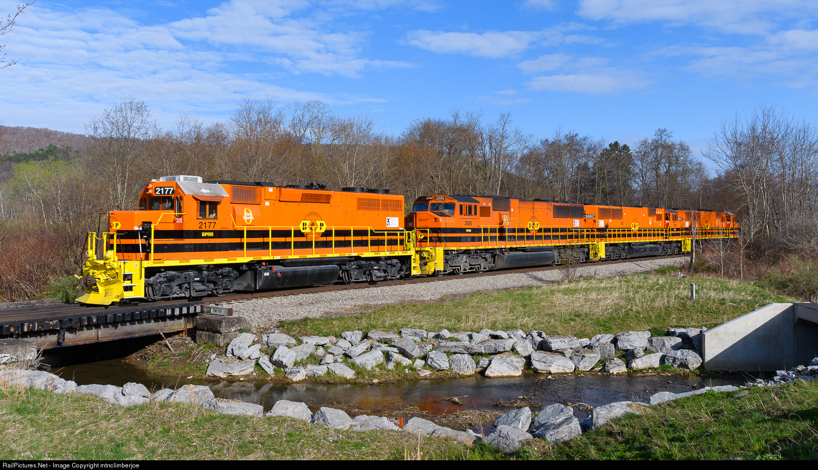 | With an ex-NS GP38-2 leading a trio of SD60's, a Buffalo & Pittsburgh stone extra heads south through Limestone, New York on a Sunday morning. The train crosses over the small bridge over Leonard Brook as the tracks parallel Route 219. |