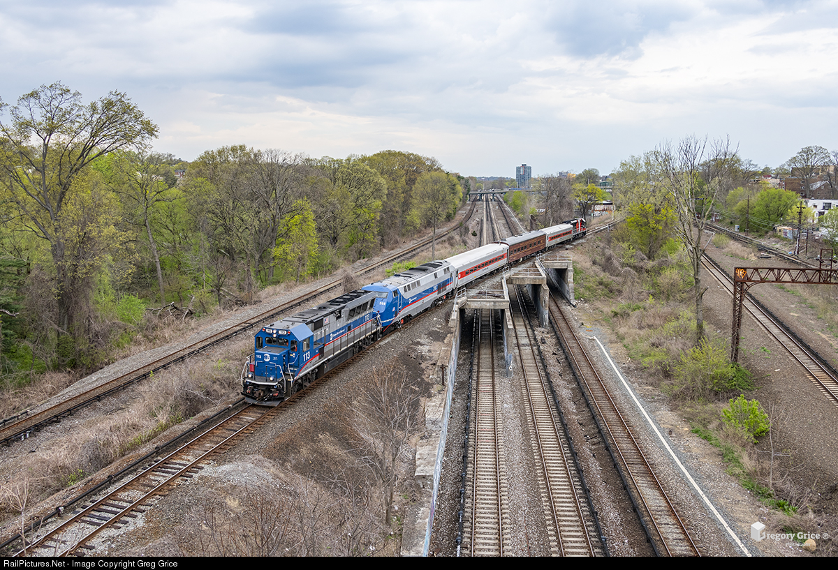 The Metro North/ Department of Transportation Geometry Train cruises over the Harlem Line and exits the New Haven Line on the Woodlawn Junction flyover in the Bronx borough of New York City. The train is tasked with traversing all of Metro North's mainline track while the middle coach, DOTX 221, collects geometry data reports for the FRA and US Department of Transportation.