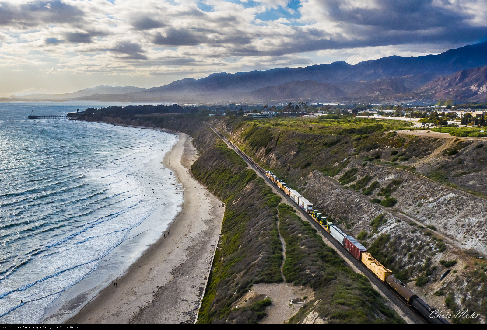 | Approaching Carpenteria as the sun gets low, the northbound Guadalupe local makes the climb up from sea level to the top of the Carpenteria Bluffs. |