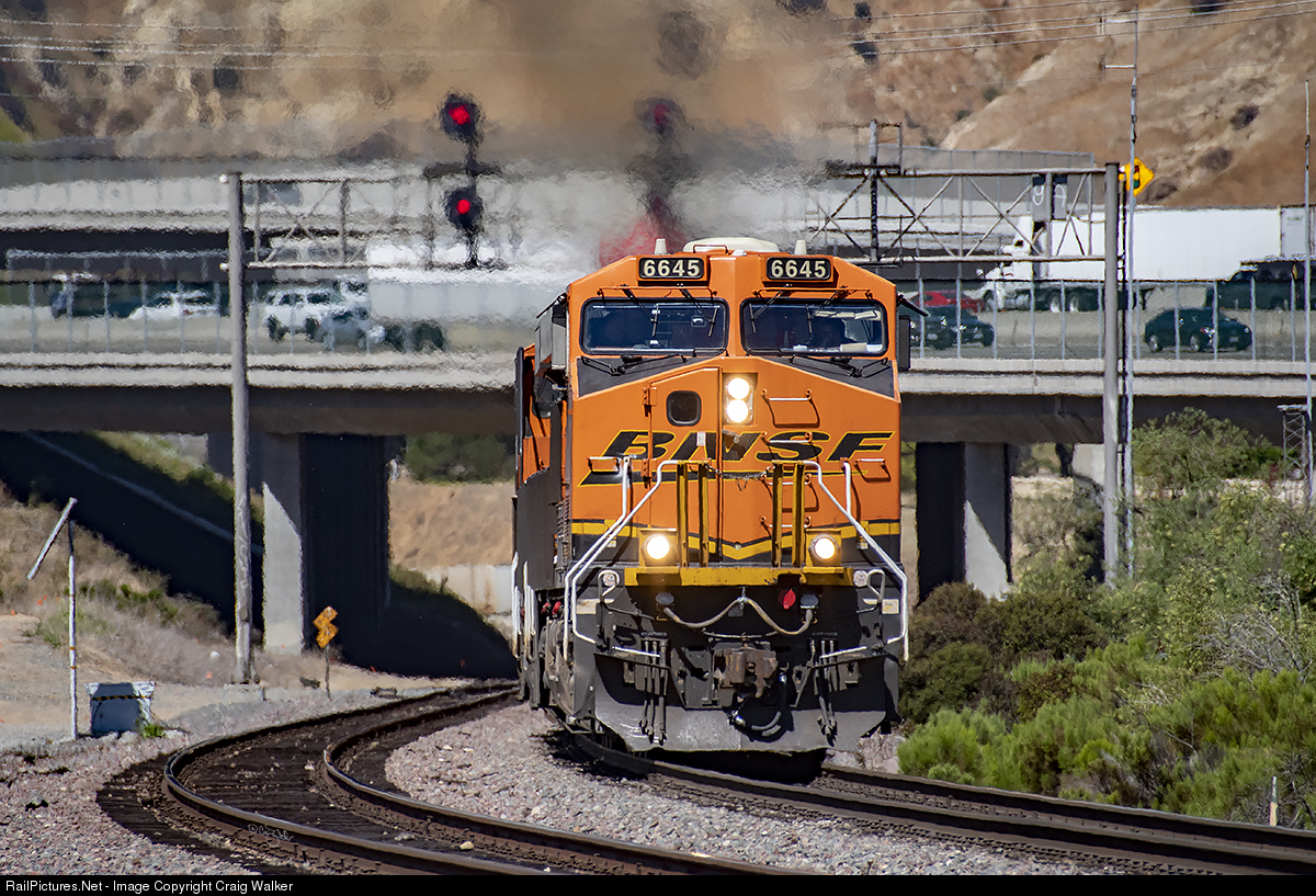 Heat waves rise off the five locomotives leading BNSF Railway Z-LACLPK9-28 as it passes under California Highway 91 at Prado Dam on its way from Los Angeles to Kansas City KS. This intermodal train is powered by ES44C4 6645, ES44C4 6507, ET44C4 3733, ES44DC 7816 and Dash 9-44CW 5209. (Corona, California – April 28, 2021)