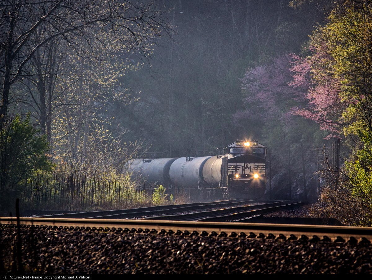 | Norfolk Southern #3624 leads a manifest freight through the fading fog and silence of Oakvale, West Virginia on the morning of April 26, 2021. |
