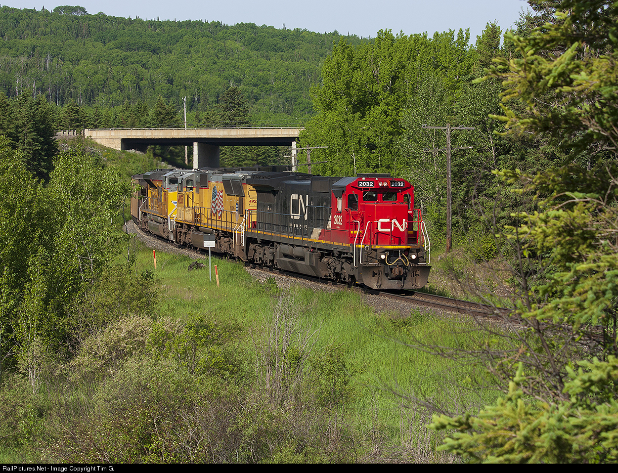 CN 2032 leads a couple of UP visitors and 76 coke loads downgrade towards Thunder Bay passing endless fresh green boreal forests.