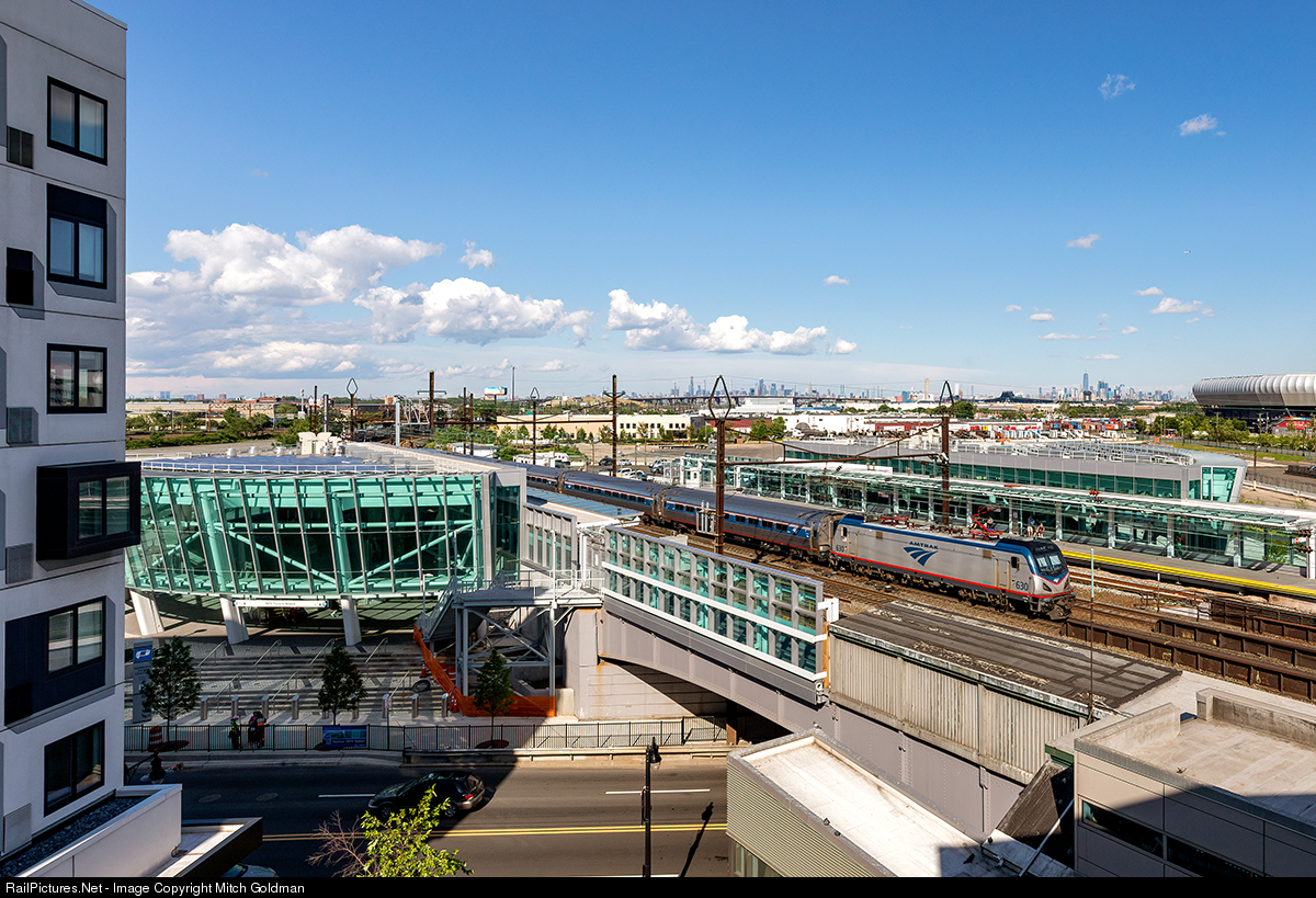 With the New York City skyline serving as backdrop, AMTK No. 630 leads a westbound Amtrak Regional Express past the newly rebuilt Harrison Station. Newark station is just ahead, across the Passaic River and serves both Amtrak and NJT, as Harrison is solely used by PATH (Port Authority Trans-Hudson subway trains). The large open and airy glass stations were completed, October 30th, 2018 for the westbound, and June 15th, 2019, eastbound.