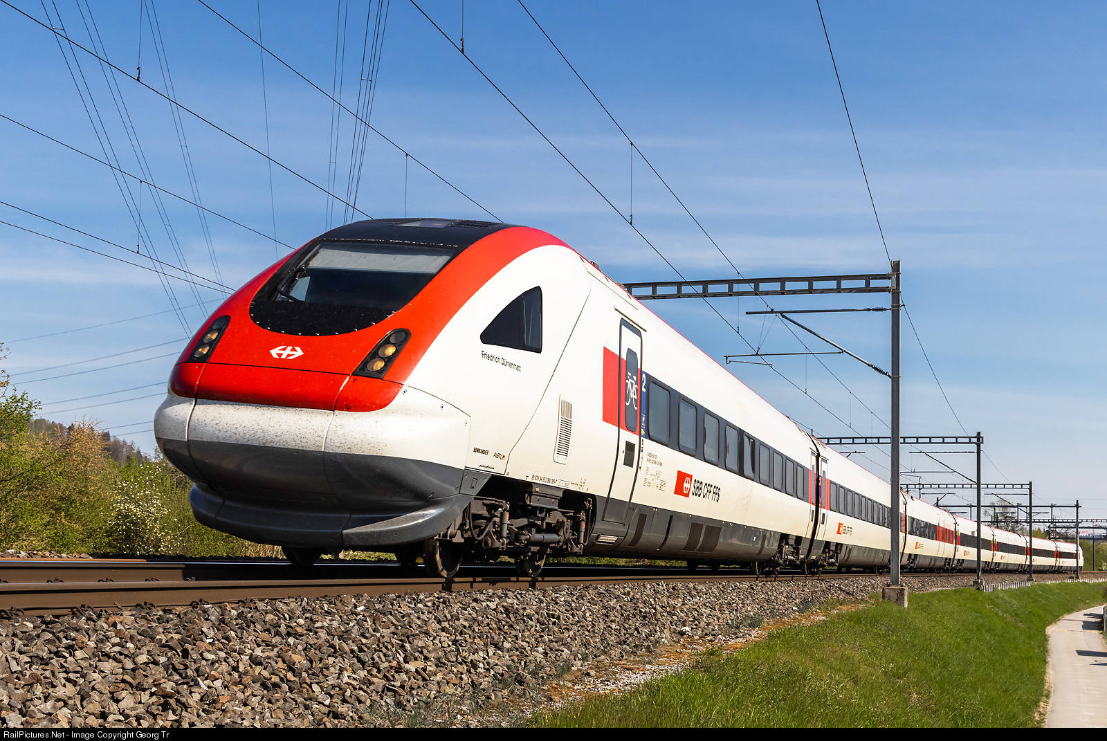 | Intercity tilting train (ICN) RABDe 500 # 009 "Friedrich Dürrenmatt" is running at 125 km/h (77,7 mph) the IC 1516 of the line IC5 from St.Gallen via Winterthur-Zürich-Olten-Biel-Neuchâtel-Yverdon-les-Bains to Lausanne, between Winterthur and Winterthur Tössmühle. 44 of this 200 km/h trains were built between 1999 and 2005 by Adtranz/FIAT-SIG Neuhausen respectively Bombardier Pratteln/Zürich and Alstom Neuhausen, the design came from Pininfarina. |