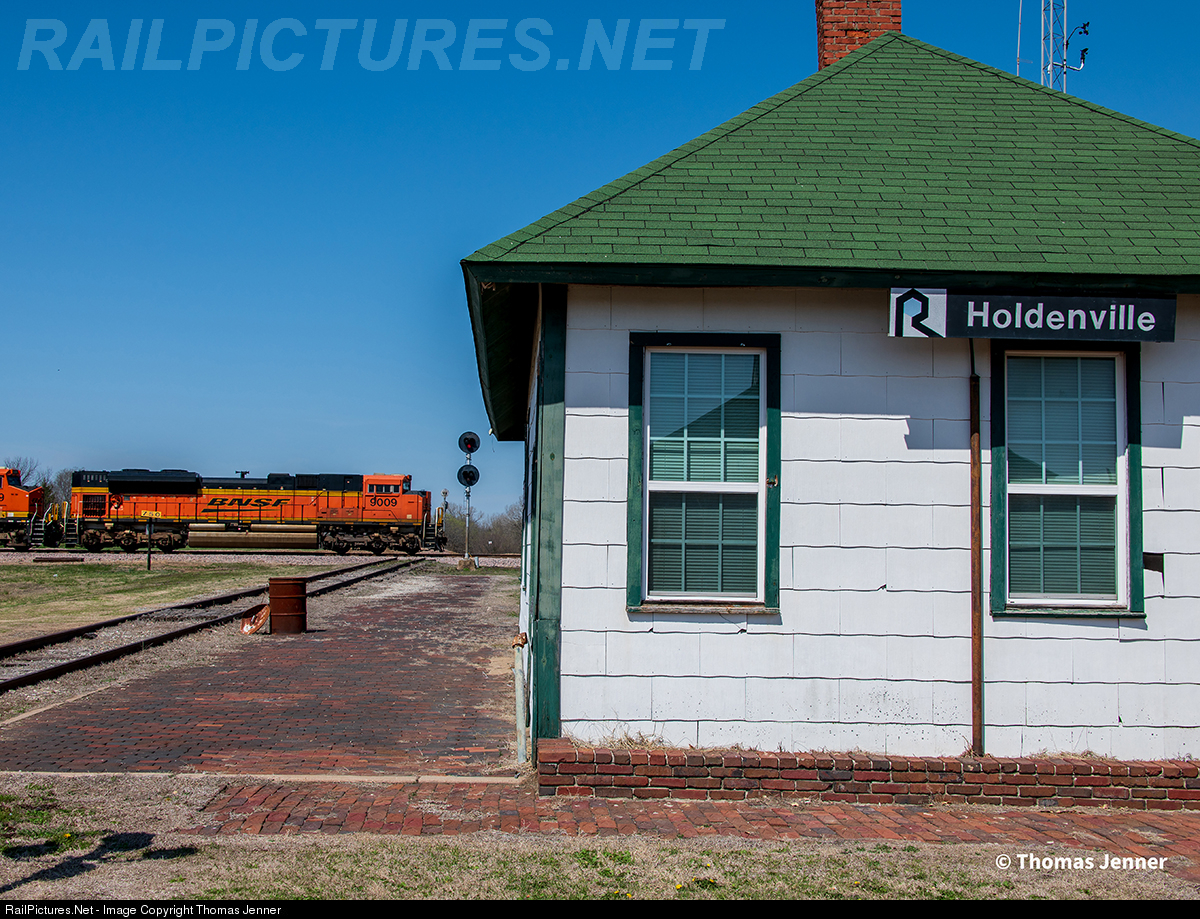 BNSF 9009 rolls past the Rock Island Depot in Holdenville, OK
