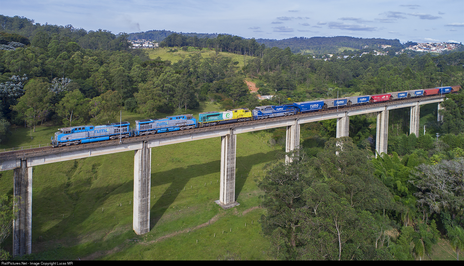 Northbound empty O51, departs ZGA-154 yard, led by AC44i #9810 (the first one from Rumo) with a special guest in the consist: the Eldorado SD70ACe. The viaduct is located at track section between Guaianã and Pantojo.