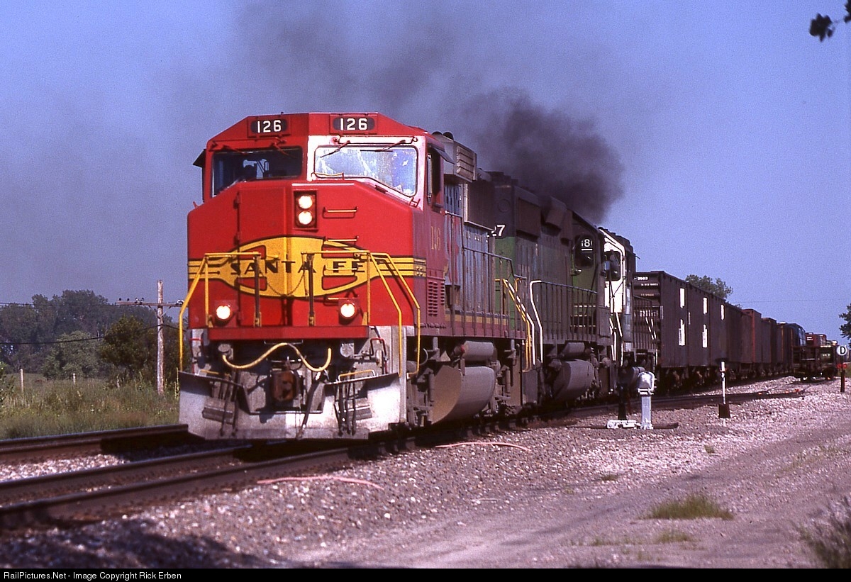 Charging into the late afternoon sun, ATSF 126 leads a westbound manifest, far from its original and intended haunts along the Transcon. By now the Super Fleet units have migrated to most parts of the enlarged system and add a dash of warbonnet verve to the previously ubiquitous BN green and Grinstein colors on the northern lines. Fuji Provia.