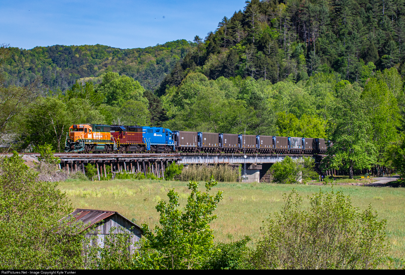 | Tennessee Valley Railroad Museum pulled 105 hoppers out of storage from Copperhill,TN bound for scrap. TVRM operates a section of the former L&N 'Old Line' or 'Hook & Eye Line' between Etowah and Copperhill mainly running the tourist train and a very occasional storage car move. GMTX GP38-2's #2005 & #2004 bracket TVRM GP38-2 #5109 as they ease across the Hiawassee River at Reliance,TN. |