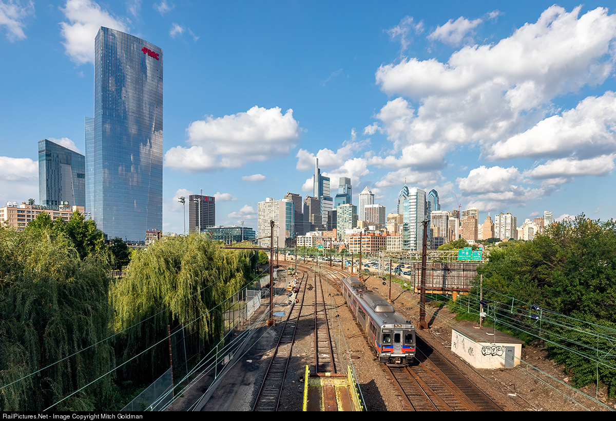 Looking all the more diminutive against a growing city skyline, a short out of place two car weekend SEPTA commuter train finds its way onto Amtrak's NEC (North East Corridor) due to a project called "The Southwest Connection Improvement Program" which took place between August 4th to August 19th, 2018.