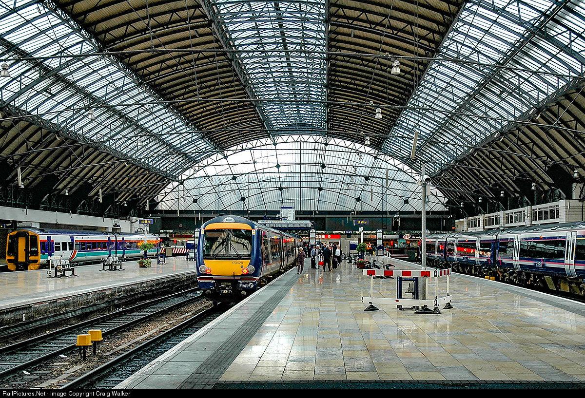 | In this view of Glasgow’s Queen Street station (Sràid na Banrighinn) a First ScotRail (SPT) 170 class diesel multiple-unit Turbostar 170 428 can be seen on track 4. These DMUs were constructed by Bombardier Transportation in 2003/2004. (Glasgow, Scotland, UK – June 25, 2007) |
