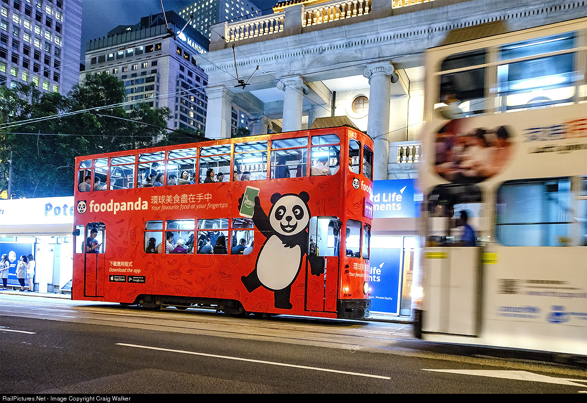 Operating on Hong Kong Island between Kennedy Town and Shau Kei Wan (with a branch circulating through Happy Valley, is a 3 ft 6 in (1,067 mm) narrow-gauge tram system. Hong Kong Tramways (香港電車) is one of the earliest forms of public transport in the metropolis, having opened in 1904 when the island was under British rule. HKT has used electric trams since its inauguration. It owns the world's largest operational double-decker tram fleet, and is a very rare example of a tram system that uses them exclusively. In addition to being used by commuters, the system is popular with tourists, and is one of the most environmentally friendly ways of traveling in the city. HKT car 43, seen on Bank Street (and wrapped to advertise "foodpanda"), was built in 1912 by United Electric Car Company of Preston, England. (Hong Kong, China – May 30, 2016)