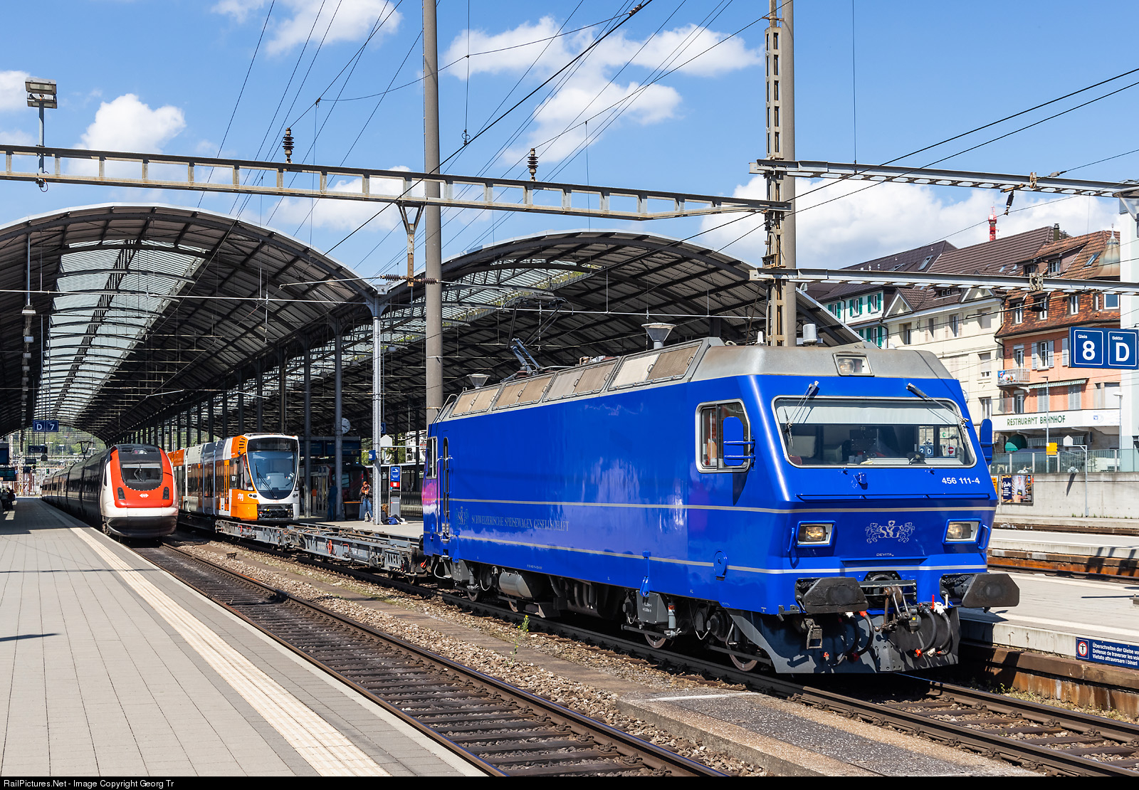 | Re 456 # 111 of the BRM in the Schweizerische Speisewagen Gesellschaft paint scheme of Bruno Müller, is pulling 4 lowloader cars with the 1 meter gauge "Tango" streetcar Be 4/10 # 1836 for the TPG (Transports Publics Genevois) through Olten. The load comes from the Stadler work in Altenrhein, the train started in Frauenfeld and goes to Geneve La Praille. |
