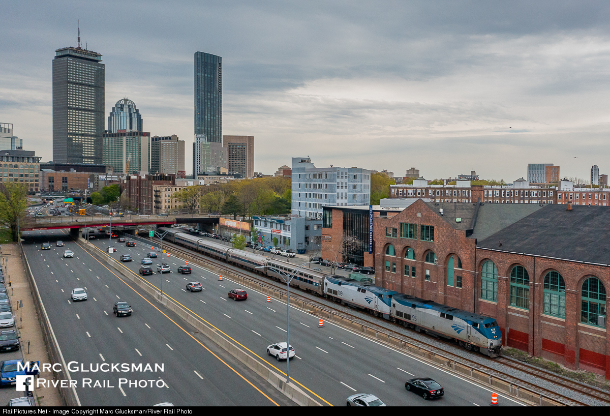 Bye Boston. Amtrak's Lake Shore Limited Boston Section (Train 449) has just left Boston's Back Bay Station next to the Massachusetts Turnpike/Interstate 90 on Sunday, May 2, 2021. GE P42DCs 95 and 109 lead a 5 car consist, lengthened by the presence of former New York Central Railroad (now Webb Rail) Budd Observation Car "Babbling Brook".