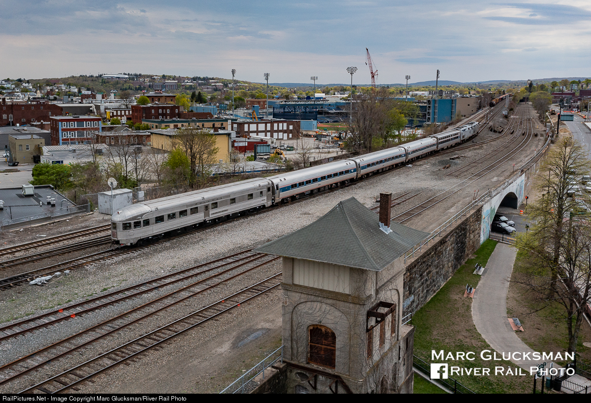 Welcome to Worcester, dollar twenty-five, please. The now closed tower at the west end of the Worcester Station complex still stands guard over the tracks, as seen on Sunday, May 2, 2021. The former New York Central Railroad Budd built Pullman obs/diner/sleeper "Babbling Brook" (WEBX 800007) held the markers on Amtrak's Lake Shore Limited (Train 449) from Boston, MA to Albany-Rensselaer, NY and heads towards its next stop in Springfield, MA. More on the Webb Rail fleet at www.webbrail.com