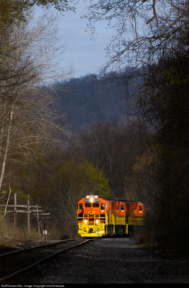 | Freshly painted Buffalo & Pittsburgh GP38-2 2177 catches a sliver of morning light as it leads three SD60's. This loaded stone extra is departing Salamanca and approaching Kill Buck, New York as it begins its journey south. |