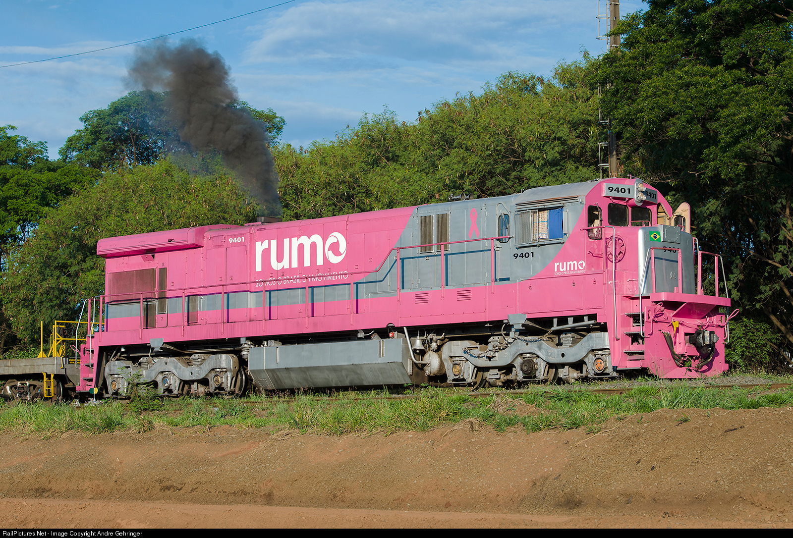 Rumos GE C30-7 9401, ex-BNSF 5417, with The Pink Ribbon paint.