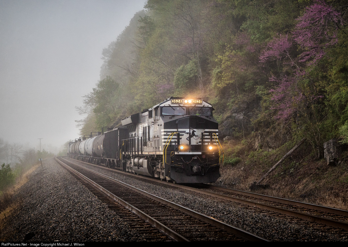 | Norfolk Southern #3624 slips through the fog with its manifest freight train outside of Narrows, VA on NS' Christiansburg District during the early morning hours of April 26, 2021. |