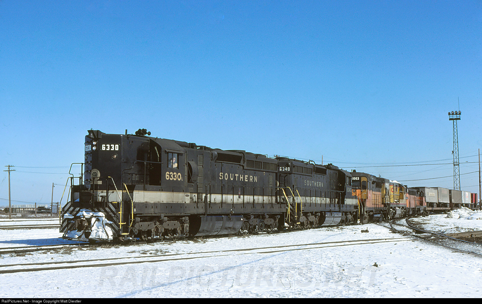 A Precision National Leasing SD24, still in Southern paint, leads five other units on a Milwaukee Road train at Bensenville, Illinois. This was during the power shortage after bankruptcy and a mean winter for the record books. Photographer James Claflin caught them on a sunny early spring day on March 4, 1978.