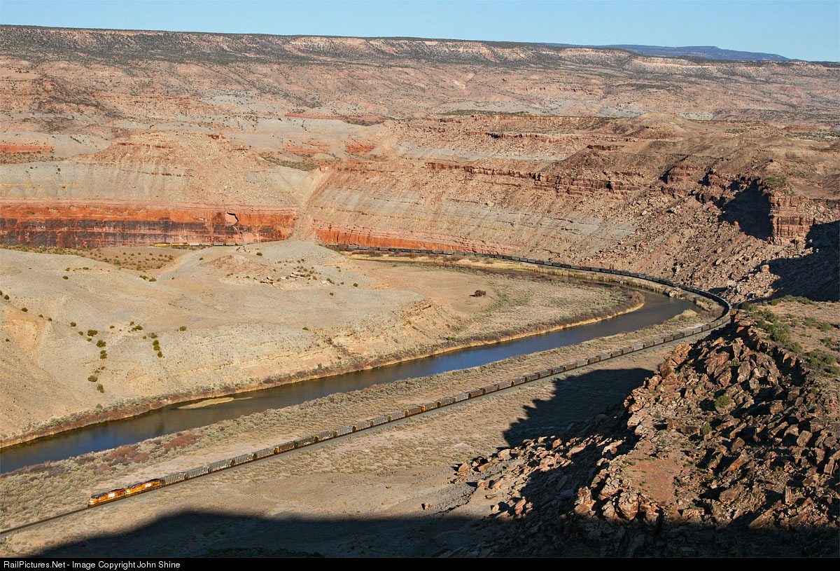 As the morning shadows slowly move out of the bottom of the canyon, Union Pacific #8015 leads an empty coal train Eastbound down the N. Fork Branch and alongside the Gunnison River, just South of the siding at Bridgeport. This location is near Milepost 28 which is how many miles out of Grand Jct. and the train will continue another 66 miles to the W. Elk coal mine located at the very end of the Branch. The rear DP's can also be seen back at the end of the train.