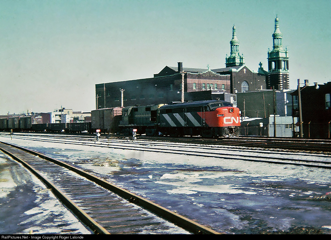 Canadian National MLW FA-2 9449 and CN MLW RS-18 3873 leading a westbound freight at Montreal (St-Henri), Quebec on March 21, 1965.