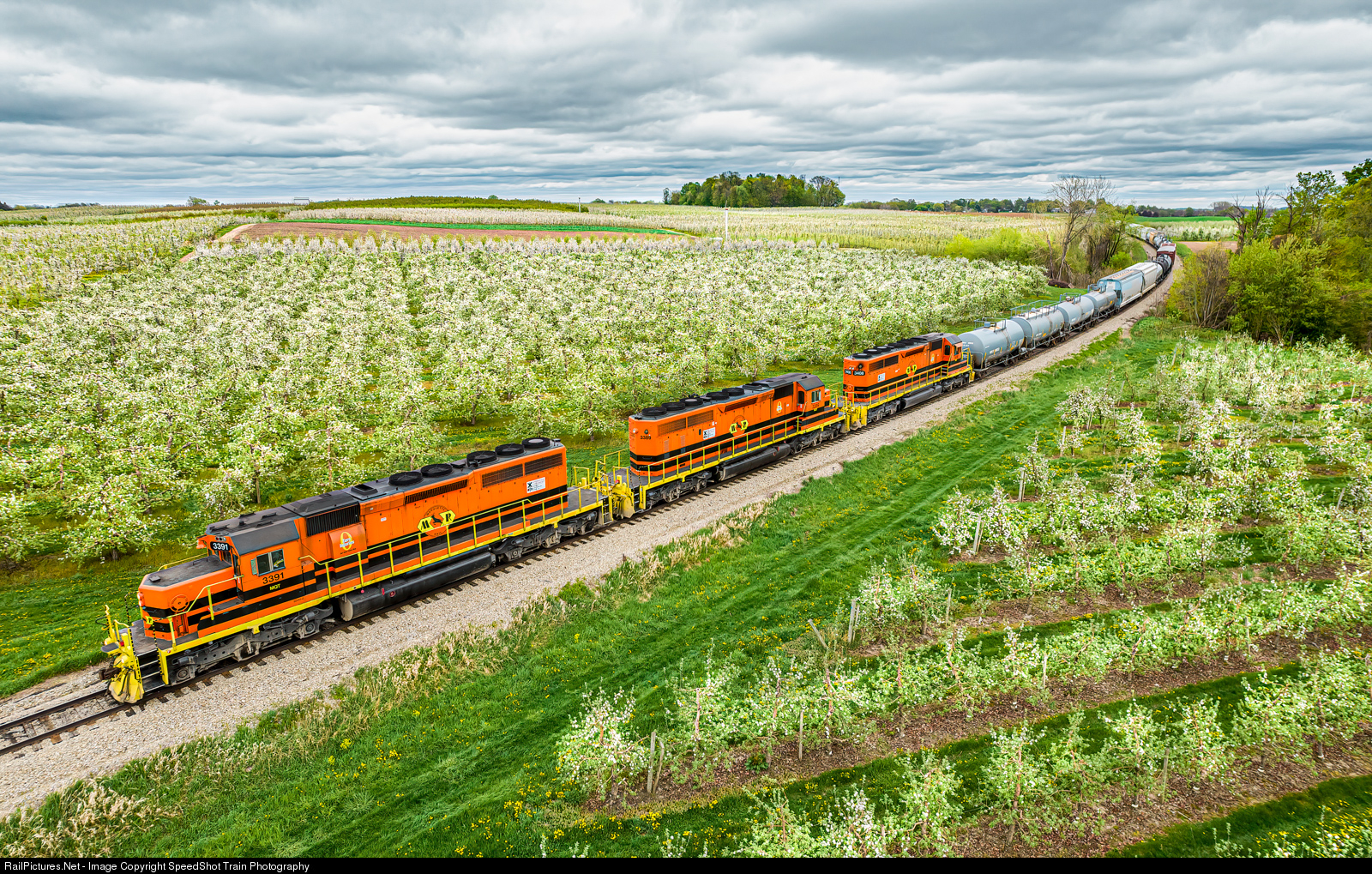 MQT 3391 Leads a three unit manifest Northbound through the blossoming Apple trees in Michigan's Northern Lower Peninsula farmland