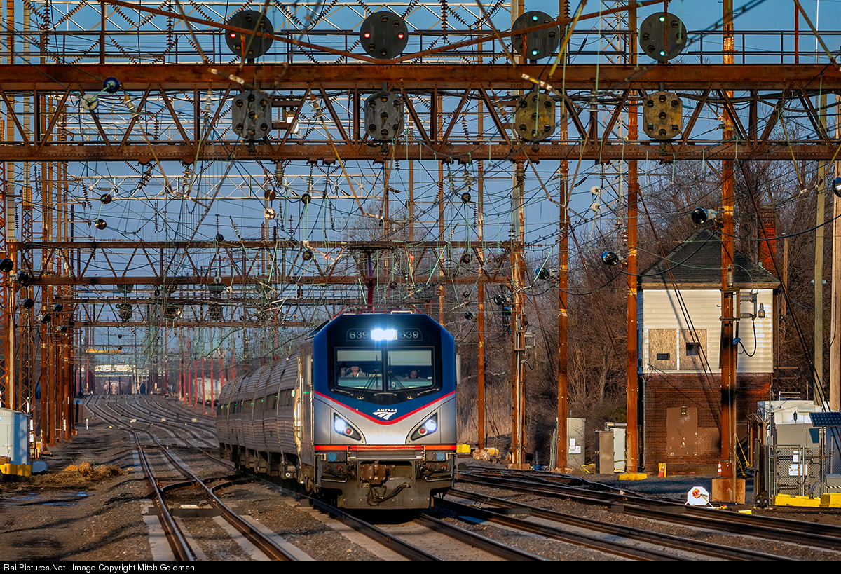 | A early evening Amtrak Regional Express charges down the Northeast Corridor passing "HOOK" tower while ducking the surviving signal bridge en route to Wilmington, DE. Hook tower was built by the PRR in 1905 and remained in operation up until 1999. |
