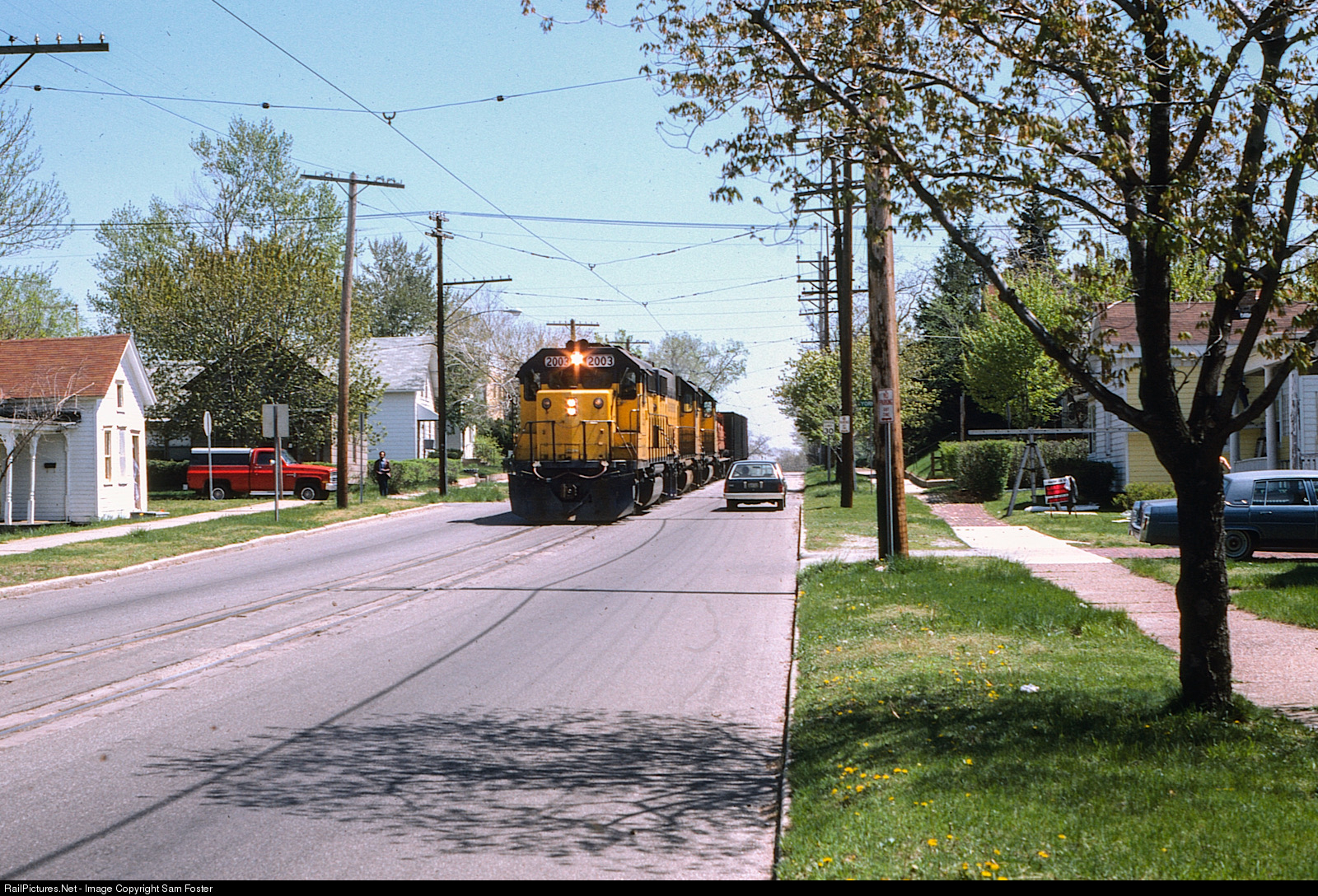 On May 5th, 1987, a short CSS freight heads west on 11th Street in Michigan, City, IN with a trio of GP38-2s.