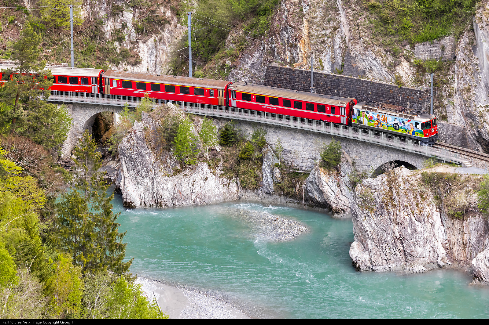 Ge 4/4 II # 611 of the Rhaetian Railway, in the colorful publicity paint scheme for LogIn, is pulling the Regio Express 1728 from Disentis/Mustér via Ilanz-Chur to Landquart, and further as RE 1237 via Klosters to Scuol-Tarasp, along the Vorderrhein between Trin and Reichenau-Tamins. Here, where the ruins of the Wackenau fortress are standing on a rock, there is the most narrow strait of the river, and there is a sign on the rock which shows the historical most hight of the water. On this day/time there were about 38 m3/second, the flood can reach 200 m3/second. Between the track and the river, there is a beautiful hiking path from Trin to Reichenau. The view of the photo is from the hiking path on the other side of the gorge.