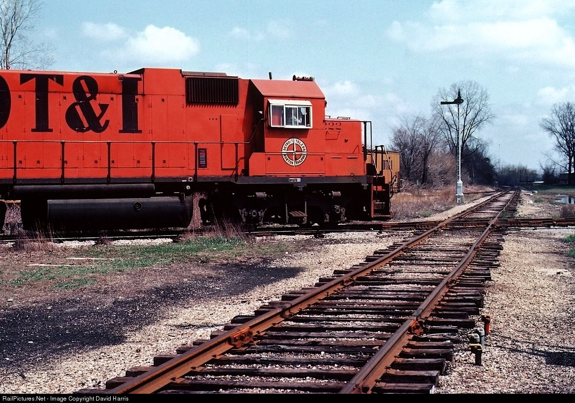 The DT&I crew leaves their small yard and heads for the Campbell Soup plant across the Maumee River. That's the N&W they are about to cross. In the background a DT&I reefer sits on the interchange track. When they finish at the soup plant, they will head for the mainline at Malinta.