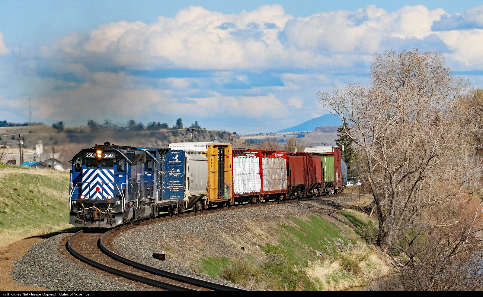 The Gallatin Rocket rips through a river curve with a neat set of clouds high above. Leading this train is the rarely shot MRL 250, THE MRL locomotive. On October 31st, 1987, on the eve of MRL ownership, "vandals" set a 3 unit consist up Bozeman Pass at full throttle, of which the BN #6377 was part. After reaching over 80 mph. the train finally buried itself into the earth at West End. Not originally part of the sale, the BN then sold the #6377 to the MRL where it was rebuilt as the #250. It would become, and remain, the only SD40-2 the MRL would own. 34 years later, still earning its keep.