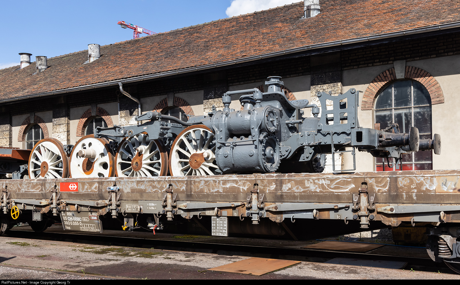 This are the driving wheels, frame with cylinders of the Lima built 2-8-2 steamlocomotive 141 R # 73, former french SNCF, loaded on a freight car of the SBB. This parts, including boiler and tender of this locomotive were stabled in Winterthur for nearly 2 decades in a shed, and are now leaving to Vallorbe. The 141 R # 73 was built in 1945 and delivered to France and withdrawn in 1974.