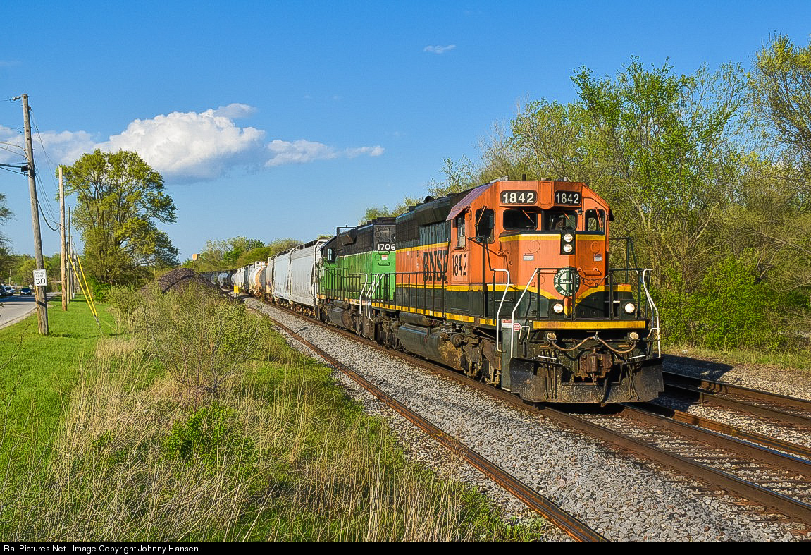 A pair of SD40-2’s take one of BNSF’s ‘Joliet locals’ (train Y-JOL202) based out of Joliet Yard. Seen here heading west out of town, and making their way towards Blodgett, Illinois to work INEOS Styrolution America LLC, DUPONT, Hoffman Transportation and various other industries a couple of miles to the southwest of town. The lead SD40-2, BNSF 1842 wears the BNSF H1 scheme while the trailing SD40-2, BNSF 1706 still wears its Burlington Northern green.