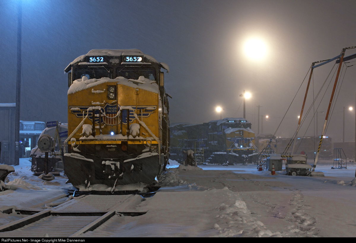 A spring snowstorm blankets the Denver, Colorado, area as Union Pacific locomotives rest into the night of April 15, 2013, at UP’s former Rio Grande North Yard locomotive facility.