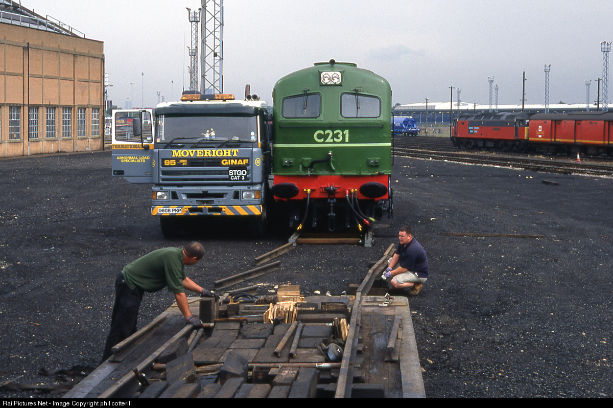 Old Oak Common depot, in London, held an open weekend, Railfan event, in August 2000. 2 days after this, preserved Irish Rail C231 is being loaded onto a lorry (truck) ready for it`s journey home. Very unusual to see Irish locos in England, although many were built there and some were scrapped there.Ireland uses 5 feet 3 inch gauge track.
