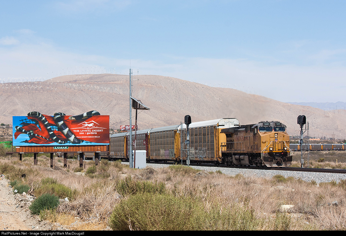 A single AC4400 leads a Mira Loma bound auto train towards Cabazon as they pass a billboard for the Living Desert zoo (which itself is worth a visit!).