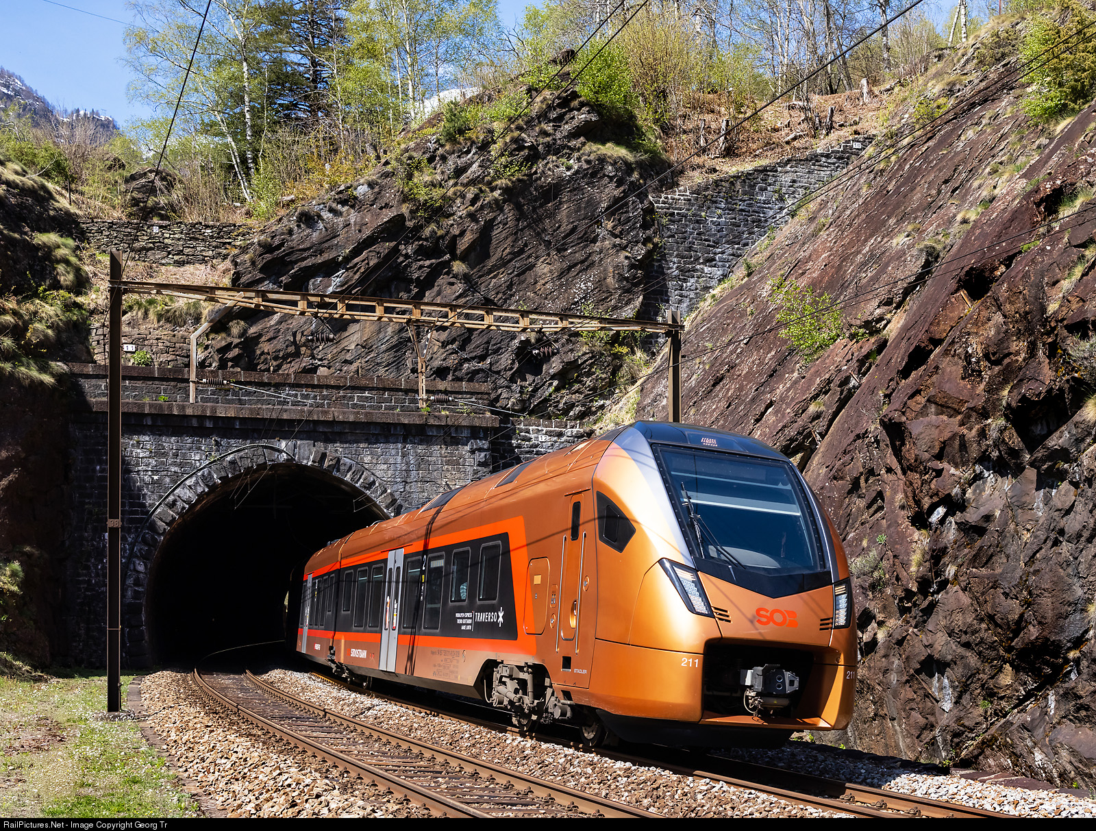 "Traverso" train RABe 526 # 211/111 of the Südostbahn (SOB), built by StadlerRail, is running the "Treno Gottardo" Interregio 2315 of the line IR 26 from Basel via Olten-Lucerne-Arth-Goldau-Gotthard mountain line-Bellinzona to Locarno, leaving the Artoito tunnel on the Gotthard south ramp between Rodi-Fiesso and Faido.