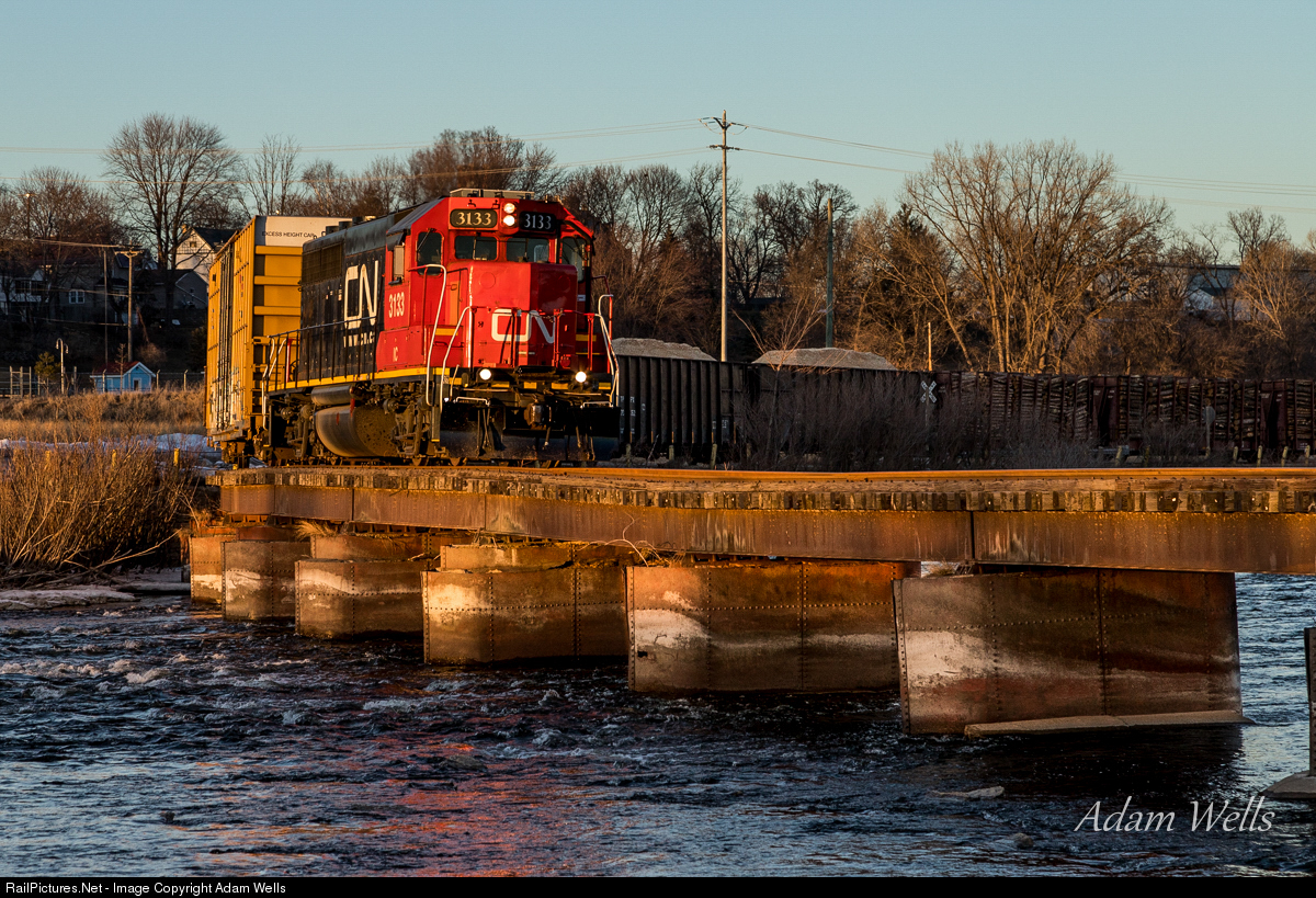 | CN L523, from Neenah to Kaukauna, was on the shove as they back up to swap loads of pulp wood and logs into the paper mill in Kaukauna just a bit before the sun went down.