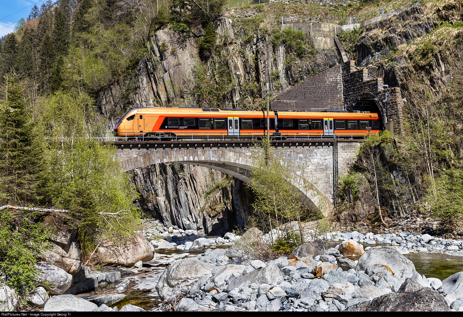 "Traverso" train RABe 526 # 210/110 of the Südostbahn (SOB), built by StadlerRail, is running the "Treno Gottardo" Interregio 2328 of the line IR 26 from Locarno via Bellinzona-Gotthard mountain line-Arth Goldau-Lucerne-Olten to Basel. This hourly service between Locarno and Arth Goldau, then every two hour to Basel and the other hour to Zürich, is run in co-operation by the SOB with the SBB since december 2020. The train is leaving the 1084 meter long Wattinger loop tunnel and crossing the 40 meter long lower Wattinger bridge over the Reuss, between Wassen and Gurtnellen.