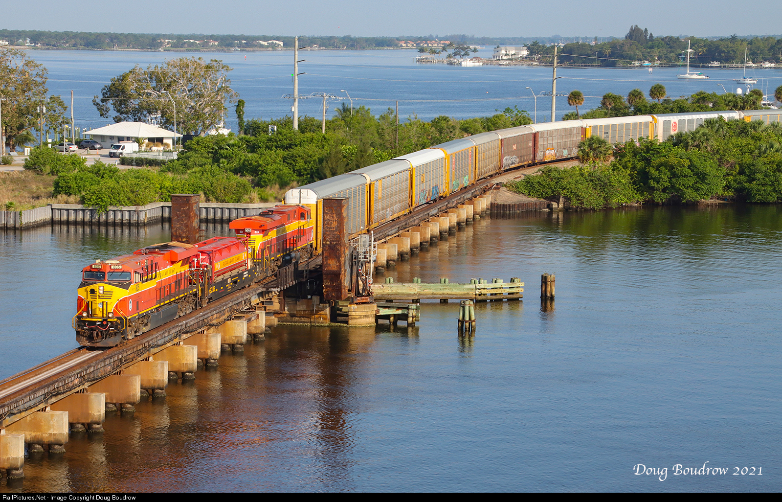 | Southbound Florida East Coast train 109 is seen crossing the Saint Lucie River in Stuart, Florida on a beautiful Spring morning just after the sun finally poked through the clouds. |