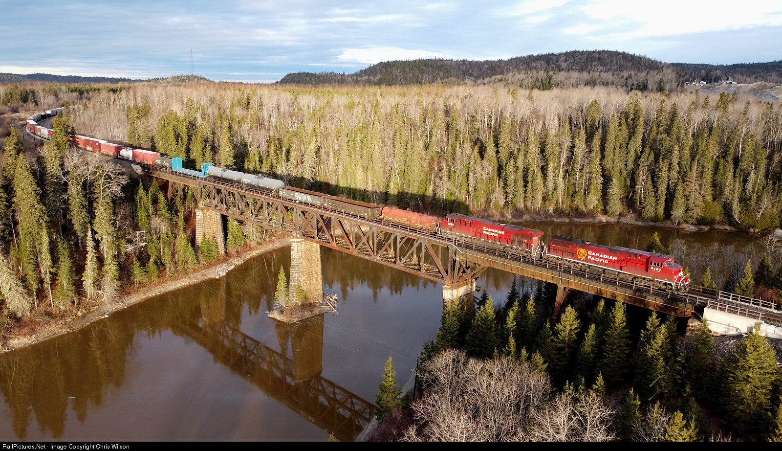 CP AC4400CWM 8107 + CP ES44AC 8959 pull 420's freight out of the siding at Heron Bay after a meet with 113-07's freight. Heading across the Pic River and climbing away from Lake Superior.