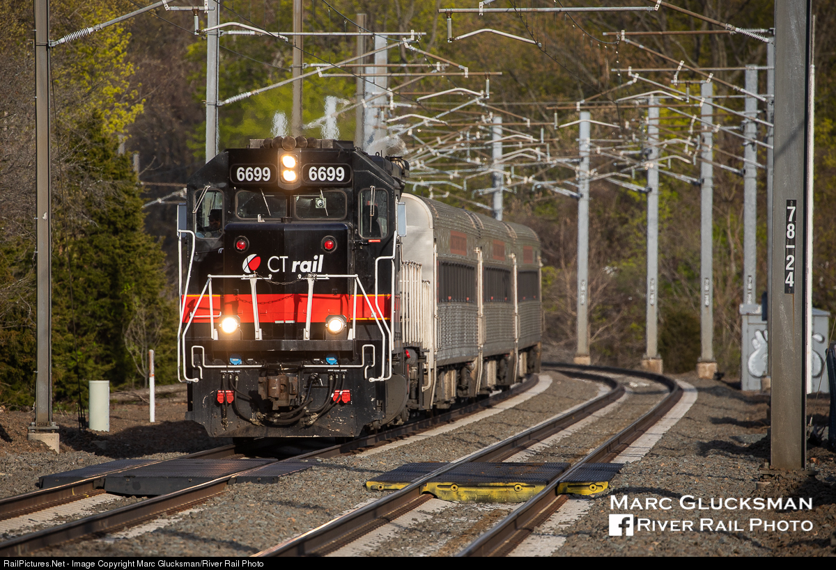 Diesel Under Wire. A strong telephoto effect draws the train close from a distance as CT Rail CTDX 6699 (GP40-3H, EMD) leads Amtrak operated Shore Line East Train 3657 passing through East Haven, CT on the afternoon of April 27, 2021. Its 3 car consist of Mafersa Coaches are ex-Virigina Railway Express, part of a unique order of 38 cars that were sold by VRE when it purchased Sumitomo / Nippon Sharyo Galley Cars. This portion of the Northeast Corridor Line was electrified in 2000 for Amtrak Acela and Regional trains. Continued work to cover all tracks is ongoing, and as more Kawasaki built M8s arrive there continues to be discussion about whether these diesel sets will see their role in SLE service reduced in the future.