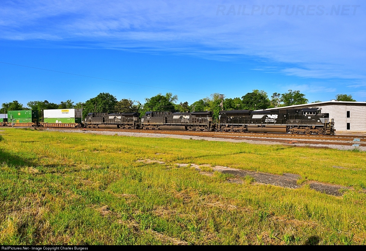 The Norfolk Southern "Barcode" unit leads a Rutherford, Pennsylvania bound intermodal train through the small town of Cordele, Georgia. This train originates daily from Jacksonville, Florida and works the intermodal facility at Inman Yard in Atlanta on their way north.