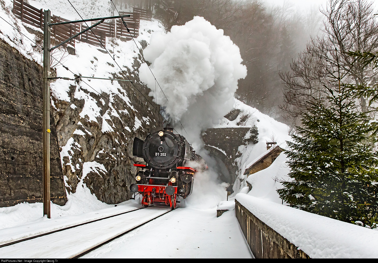 The 4-6-2 "Pacific" express train steamlocomotive 01 # 202 of the association "Pacific 01 202" in Lyss in on a test run through the gorge of the Areuse between Travers and Les Verrières. The train is leaving the 277 meter long St-Sulpice tunnel in a grade of 2.4 %. This is the international line from Neuchâtel to Pontarlier and Frasne, were 3 passenger trains a day were running then in each direction. The locomotive was built by Henschel/Kassel/Germany in 1936 for the Deutsche Reichsbahn. Withdrawn in 1975 by the Deutsche Bundesbahn and brought to Switzerland. Since 1991 operational and owned and operated by association "Pacific 01 202".