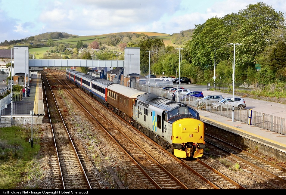 | 37688 hauls 5Z37 12:45 Crewe HS to Laira T&RSMD through Totnes on Monday 10th May 2021. The move was conveying 5 ex EMT Mk3s (41117 44047 42100 42220 and 41063) going on hire to GWR due to the problems with the IETs |